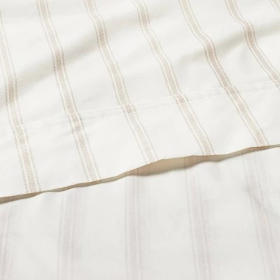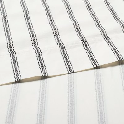 Create a comfortable sleeping spot with this Cotton Percale Tick Stripe Sheet Set from Hearth & Hand™ with Magnolia. This percale bed sheet set includes a matching pillowcase, flat sheet and fitted sheet for a coordinated look. Each of the pieces feature chic black tick stripes on a white backdrop for contrast, adding modern appeal to your bedroom decor. The soft and breathable cotton fabric ensures a comfortable night’s sleep, and can be machine washed for simple, easy care. Pair with your choice of comforter or quilt and some throw pillows for a warm and inviting bedroom setting.