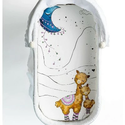A Soft and Snuggly Llama with her Mama. Designed by parents for, the super soft JumpOff Jo Llama and Mama Bassinet Sheet is sure to put a smile on your baby’s face. The original design illustrates your love for your little one all the way to the moon and back. The colorful llamas and their cozy socks mix with hues of blue, black, and white in the moon, clouds and mountains. This Mama and her llama baby will be an adorable addition to any nursery or bedroom.Β Fabric Care Details: Machine wash cold with like colors. Tumble dry low and cool iron if needed. Materials: 100% cotton.