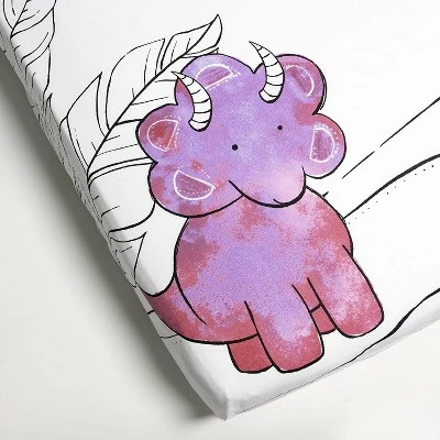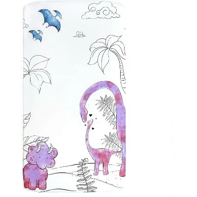 - Original Artwork – You wonโt be able to find this dinosaur design pattern anywhere else. The unique whimsical design illustrates your love for your little one through the ages. The hues of this pink Crib Sheet, including magenta, purple, blues, black and white create a prehistoric jungle landscape that will fit effortlessly into any nursery.