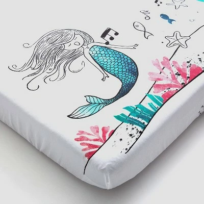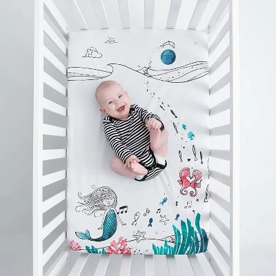 A Mini Crib Sheet You’ll Love to the Moon & Back. Designed by parents, the super soft JumpOff Jo Moonlight Mermaid Mini Crib Sheet is lovingly made from 100% cotton to be gentle on your baby’s skin. Featuring an adorable pink mermaid surrounded by schools of fish, seahorses, and starfish, this nap mat for kids will be a hit with boys and girls at home, daycare, or school. Available in an original design, the fun design will make your little one smile and fuel their imagination while they lay down to dream. The bright, cheerful reds, pinks, and blues on white will fit effortlessly into any bedroom. Fabric Care Details: Machine wash cold with like colors. Tumble dry low and cool iron if needed. Materials: 100% cotton.