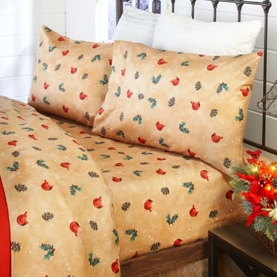 Give your bed a holiday look with these bedding sheets & pillowcases featuring seasonal icons. This winter sheets set features a repeating pattern of cardinals, pine cones and holly on a tan ground. If a festive feel is what you’re aiming for, these Christmas bed sheets and pillowcases will hit the mark. Set includes: flat sheet, fitted sheet and 2 pillowcases (1 with Twin and king sized with King). Fitted sheets have a 15″ deep pocket. Polyester. Machine care.