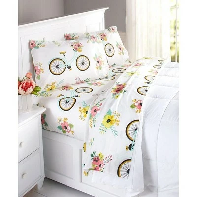 - Bicycle-themed, floral bed sheets