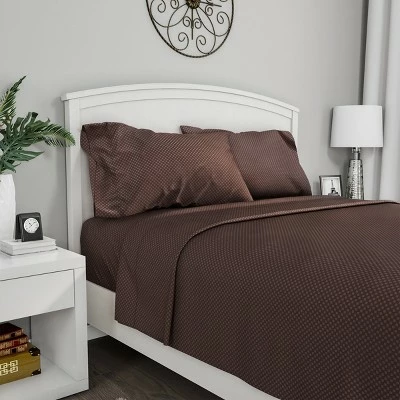 Enjoy the comfort of home and the softness of hotel quality sheets with the four-piece chocolate brown Brushed Microfiber Sheet Set by Hastings Home. The hypoallergenic brushed microfiber provides a soothing texture while the elastic fitted sheet ensures a proper fit for extra coziness. This collection is a flawless fit for any bedroom, with a classy checkered embossed design that is perfect for a guest room, as a gift, or for yourself! Material: 100 Percent Polyester Hypoallergenic Brushed Microfiber, Color: Chocolate Brown.
