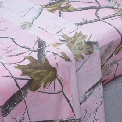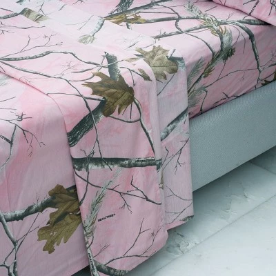 The perfect choice for the outdoorsy lady, the Realtree Camo Sheet Set blends modern comforts with the wilds of nature. Featuring a nature camo print exterior with your choice of a pink or lavender background. Includes 1 fitted sheet with all around elastic, 1 flat sheet and 1 pillow case with French fold closure. Machine wash cold, tumble dry. Available in Twin, Twin Extra Long, Full, King or Queen.