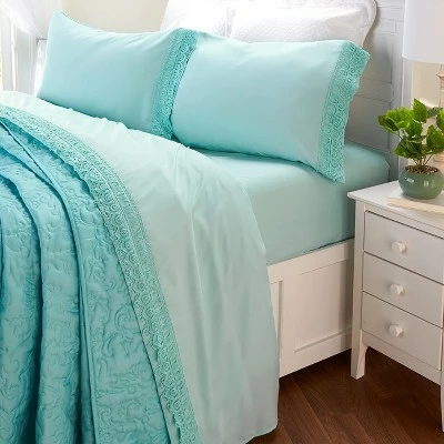 Macrame lace trims the hem of the flat sheet and pillowcase of this beautiful home bedding set. The pretty sheet set includes: Flat sheet, fitted sheet and 1 pillowcase with Twin. All pieces of this lovely bed sheets and pillowcase set are made in a soft pastel color. The lace sheet set adds a touch of feminine flair to a bedroom. Twin fitted sheet fits up to a 12″ deep mattress. Polyester. Machine care.