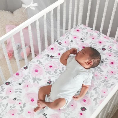 This beautiful pink and gray floral mini fitted crib sheet is made in a soft microfiber fabric. It is sized at 24β X 38β and fits most Pack N Play, portable, and mini crib mattresses. The fitted crib sheet has elastic all the way around for a safe and secure fit. It is super soft, durable, and machine washable.Please Note: This sheet is designed to fit a mini crib or porta-crib, and should fit most pack n plays; it will not fit a standard size crib.