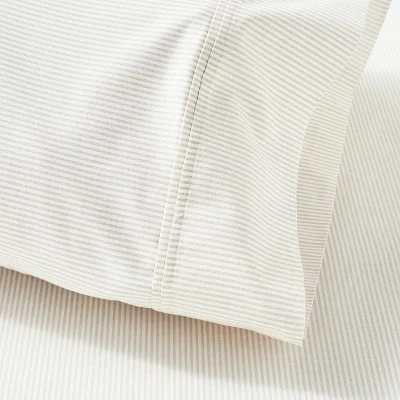 - Includes 2 pillowcases in neutral-hued microstripes on an off-white background