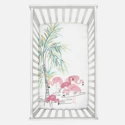 Stand Out in Crowd with this Tropical Flock of Flamingos! Designed by parents, the super soft JumpOff Jo Flamingo Family Crib Sheet is lovingly made from 100% cotton to be gentle on your baby’s skin. The Crib Sheet fits standard sized crib mattresses, featuring extra-deep corners for the most secure fit. Available in an original design of a flock of flamingos, they’ll be dreaming of warm, sunny naps before you know it! This happy, pink flock lounges under a breezy tropical palm tree, with black accents. Fabric Care Details: Machine wash cold with like colors. Tumble dry low and cool iron if needed. Materials: 100% cotton.
