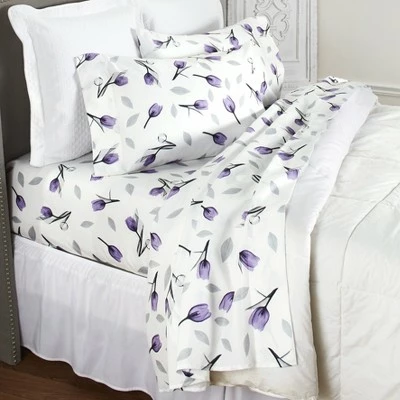 This sheet and pillowcase set will add a spring feeling to your bedroom year-round. The set features an all over purple and gray tulip print on a white background. Use it in your own bedroom or throw it on a kidβs bed to add a simple floral accent to any bedroom. Fitted sheet is for 14β mattresses. Polyester. Machine care. Set includes 1 flat sheet, 1 fitted sheet and 2 pillowcases. King size sheet set includes king size pillowcases.