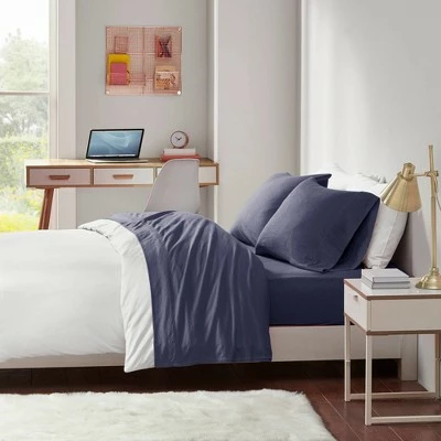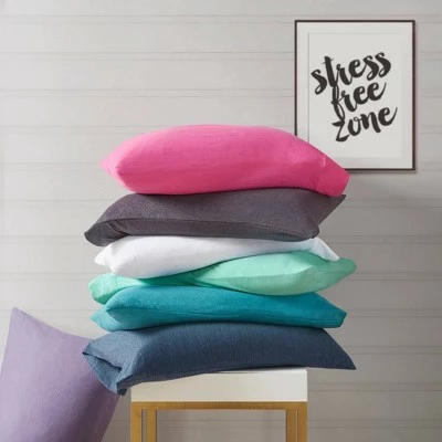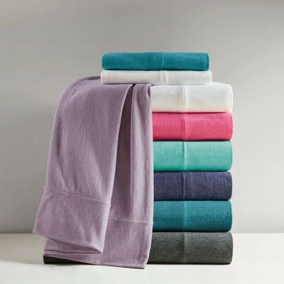 The all season jersey knit cotton blend sheet set is as comfortable as sleeping on your favorite tee. Unlike woven sheet set, this knit sheet set is easier to get into bed during cold weather or absorbent for summer. Choose from a variety of colors for comfort and style in your bedroom. Set includes 1 flat sheet, 1 fitted sheet and 2 pillowcases (1 in Twin size). Machine wash in cold water and tumble dry on low to prevent shrinkage. Fitted sheet fits up to 16 inches of mattress.