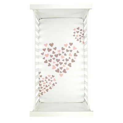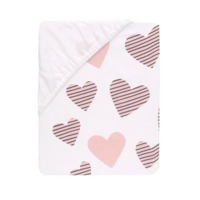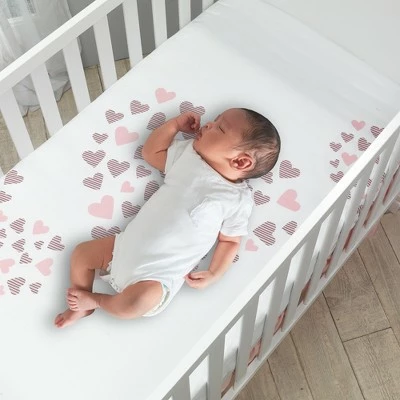 Hearts within hearts decorate this charming placement/photo ready fitted crib sheet. It is breathable and 100% cotton. It has elastic all the way around ensuring a safe and secure fit on a standard size crib mattress measuring 52 x 28β. It makes a perfect place for a photo opportunity with your little one.