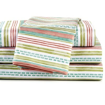 Update your linens with these striped sheets. Both the bedding sheets and pillowcases feature vertical stripes that vary in thickness. Ideal for spring and summer, the pastel striped sheets include teal, dusty pink and neutral shades that pair well with many color schemes. Make your bedroom a soothing retreat with this sheet set. Includes 1 flat sheet, 1 fitted sheet and 2 pillowcases. Fitted sheet fits mattresses up to 14″ thick. Machine wash and dry.