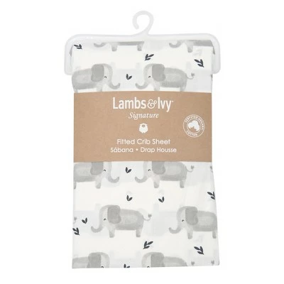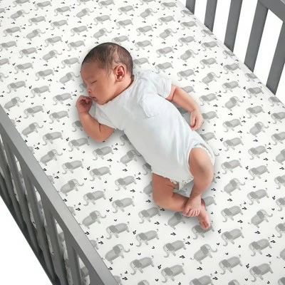 This gray stylized elephant breathable fitted crib sheet is 100% certified organic cotton. Its fully elastic perimeter provides a safe and secure fit on standard sized crib mattresses measuring 52β x 28β. The elephants are approximately 2 Β½β each in body length from trunk to tail. This watercolor print adds a chic style to your little oneβs sleep space.