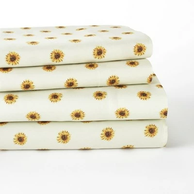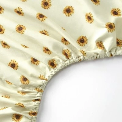Add a floral accent to any bedroom with this floral sunflower bed sheet set that includes pillow cases to tie together the theme. Included in this four-piece ensemble is a flat sheet, fitted sheet, and two matching pillowcases. The fitted sheet fits mattresses up to 14″ thick. They’re soft and comfortable for sleeping in through the night. When they’re dirty or you’re switching out the sheets for the season, simply machine wash them and then replace or store away for the season. Polyester. Machine care. Set includes: Flat sheet – Fitted sheet – 2 Pillowcases