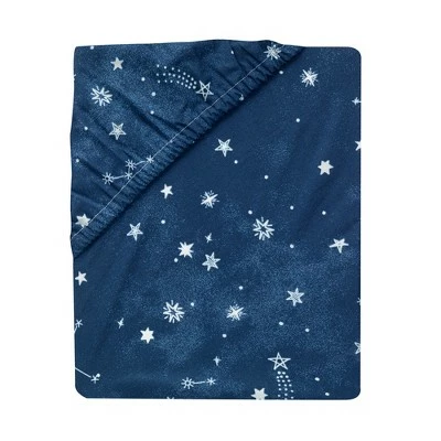 This constellation design breathable 100% cotton fitted crib sheet is on a navy-blue ground. There are hundreds of white stars in different shapes and sizes. This fitted crib sheet has elastic all the way around ensuring a safe and secure fit on a standard size crib/toddler mattress measuring 28β X 52β. This gender-neutral design works well for baby boys and baby girls.