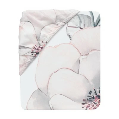 This exquisite 100% cotton fitted crib sheet has a white ground with blossoming pink and gray watercolor flowers. It is breathable cotton and has elastic all the way around ensuring a safe and secure fit on a standard sized crib mattress measuring 52β X 28β.