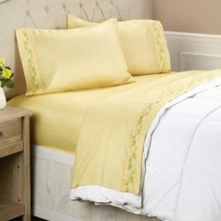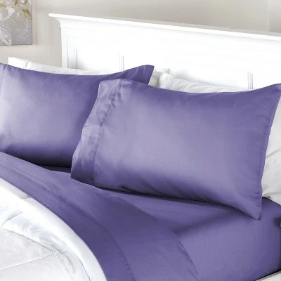 Make a fashion statement with these solid color bed sheets in deep tones of today’s popular colors of gray and lilac. Durable and easy care, the 100% cotton sheets are ideal for home bedding. The Full fitted sheet fits mattresses up to 10″ thick, while the Queen and King fit up to 12″ thick mattresses. These sheet & pillowcase sets, with a 300 thread count, are soft and comfortable for a good night’s sleep. Set includes: Flat sheet, fitted sheet and 2 pillowcases. (King-size pillowcases with King set.) 100% Cotton. Machine care.